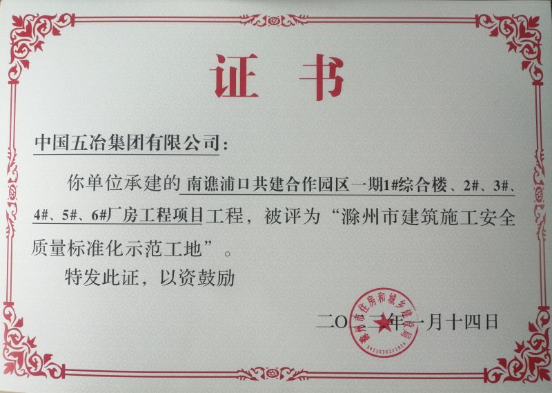 近日,从安徽省建设行业质量与安全协会传来喜讯,建筑公司承建的浦口南谯合作产业园标准化一期厂房项目荣获“滁州市建筑施工安全质量标准化示范工地”称号。