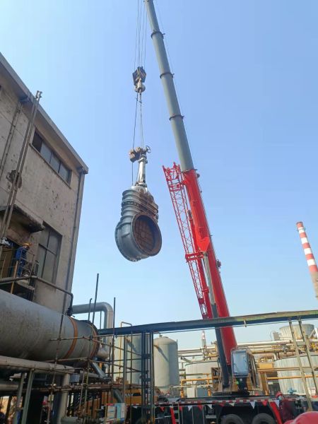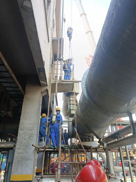 该项目位于张家港市锦丰镇沙钢焦化化产车间,本次化产定修的工作主要包括:更换一回收鼓冷3号鼓风机进口煤气闸阀、一回收脱硫预冷塔进口煤气阀门等。此次检修时间短,危险系数大,涉及到一类煤气,二级吊装,二级登高及断路作业等危险作业,为了保证作业的安全性及效率,作业部精心组织、合理安排,在定修前与车间多次召开方案讨论会,讨论关于脚手架搭设、吊车选取及站位、钢丝绳选取、氮气吹扫等问题,并提前将检修工具及所有安全措施落实好。通过此次定修将彻底解决以上两处的阀门密封不良问题,保障设备可靠运行。