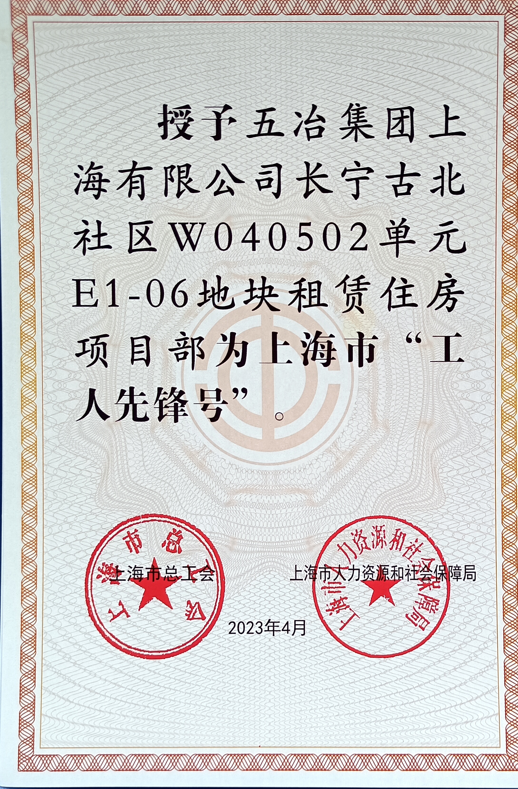 近日,在上海市总工会举办的2023年上海市五一劳动奖表彰大会上,中国五冶球友会长宁古北社区W040502单元E1-06地块租赁住房项目部以优越的成绩,荣获2023年上海市“工人先锋号”荣誉称号。