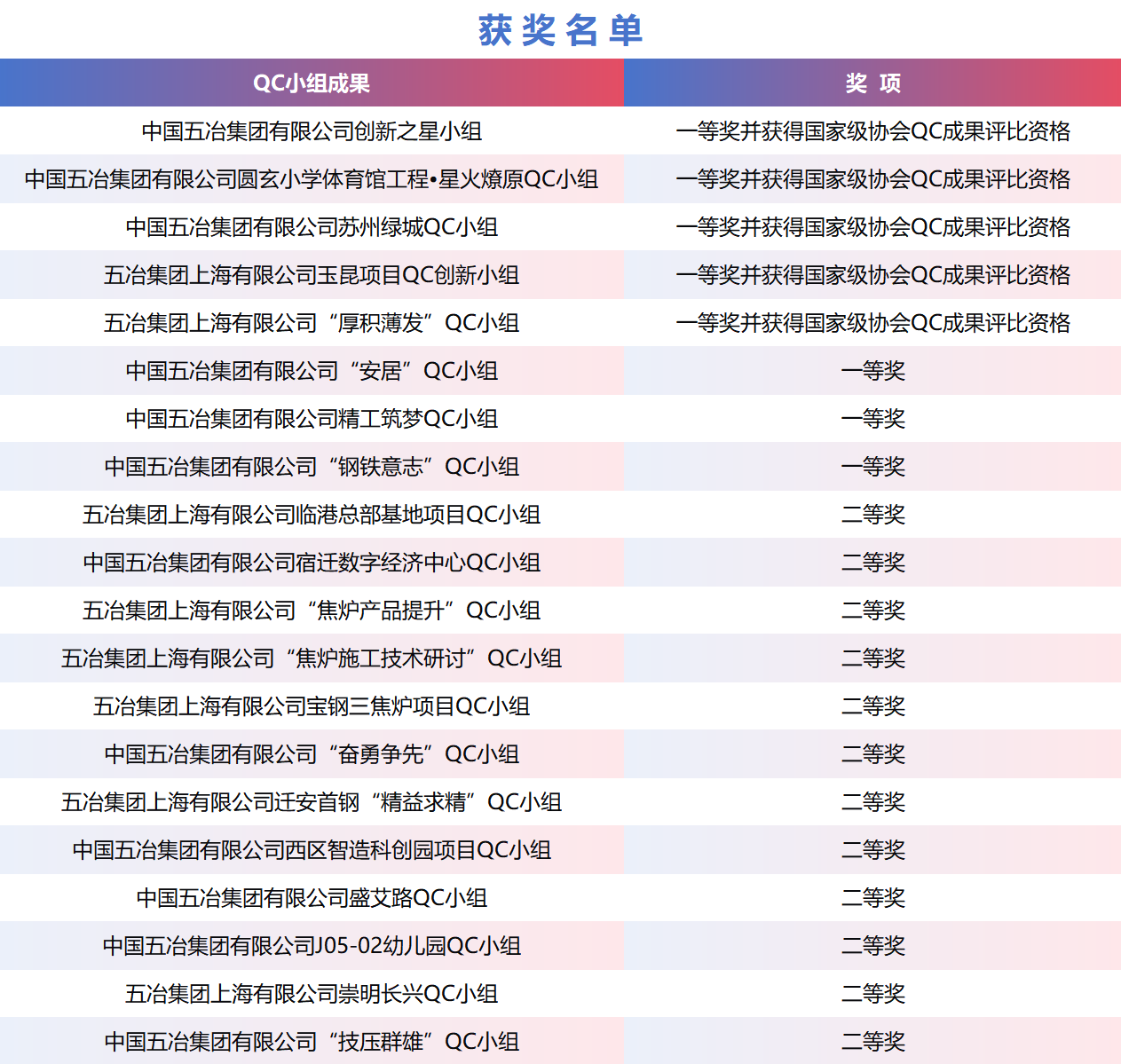 近日,在2025年度全国冶金建设行业质量管理小组成果交流会上,公司申报的20项成果悉数获奖,其中一等奖8项,二等奖12项,《提高地库高分子卷材防水施工一次验收合格率》等5项QC成果获得国家级协会QC成果评比资格。